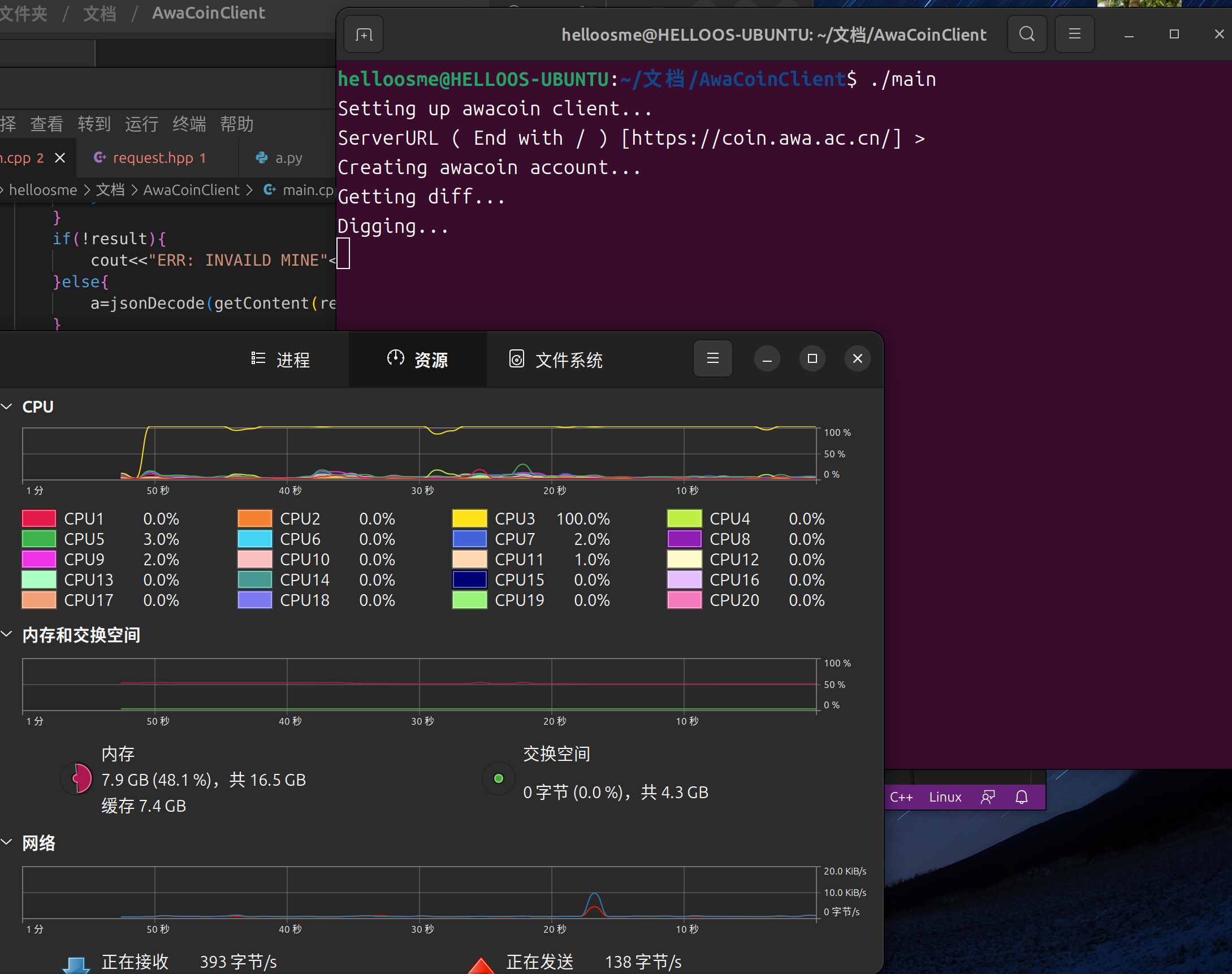 自麻鸡以娱乐性质1开发阿瓦币(awacoin)以后,聊天室里掀起了一阵挖币热潮。弄了个挖币客户端玩玩,却发现麻鸡写的代码在我的py3.10上无法运行!啊啊啊…只好选择C++来写客户端了。run!...
